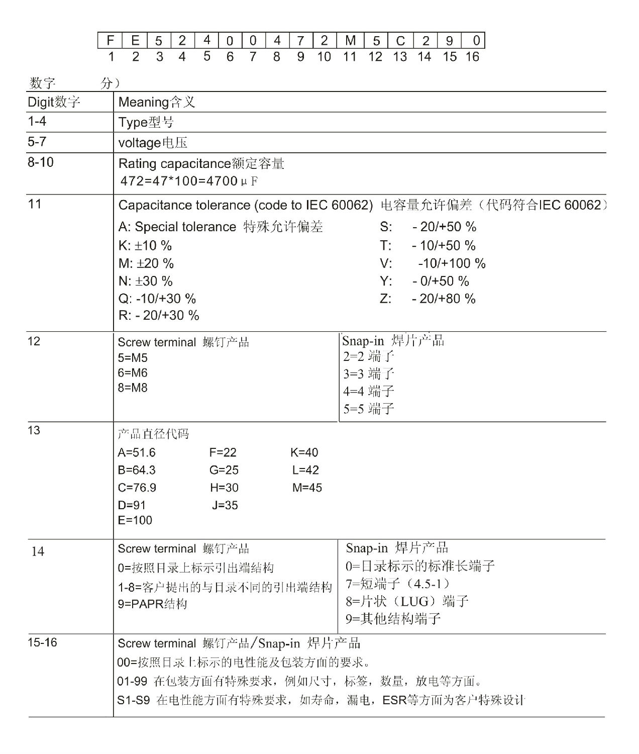 M5C290其中M代表產(chǎn)品容量偏差范圍(A:特殊允許偏差,K:±10%,M:±20%),“5”代表產(chǎn)品端子螺紋為M5(一般有M5,M6,M8三種),“C”代表產(chǎn)品直徑為76.9mm(A:51.6mm,B:64.3mm,C:76.9mm,D:91.0mm,E:101mm),“2”代表產(chǎn)品端子結(jié)構(gòu)(端子直徑有0:17.7mm,1:13.4mm,2:10mm),“90”代表客戶提出的電性能與包裝等方面的要求。